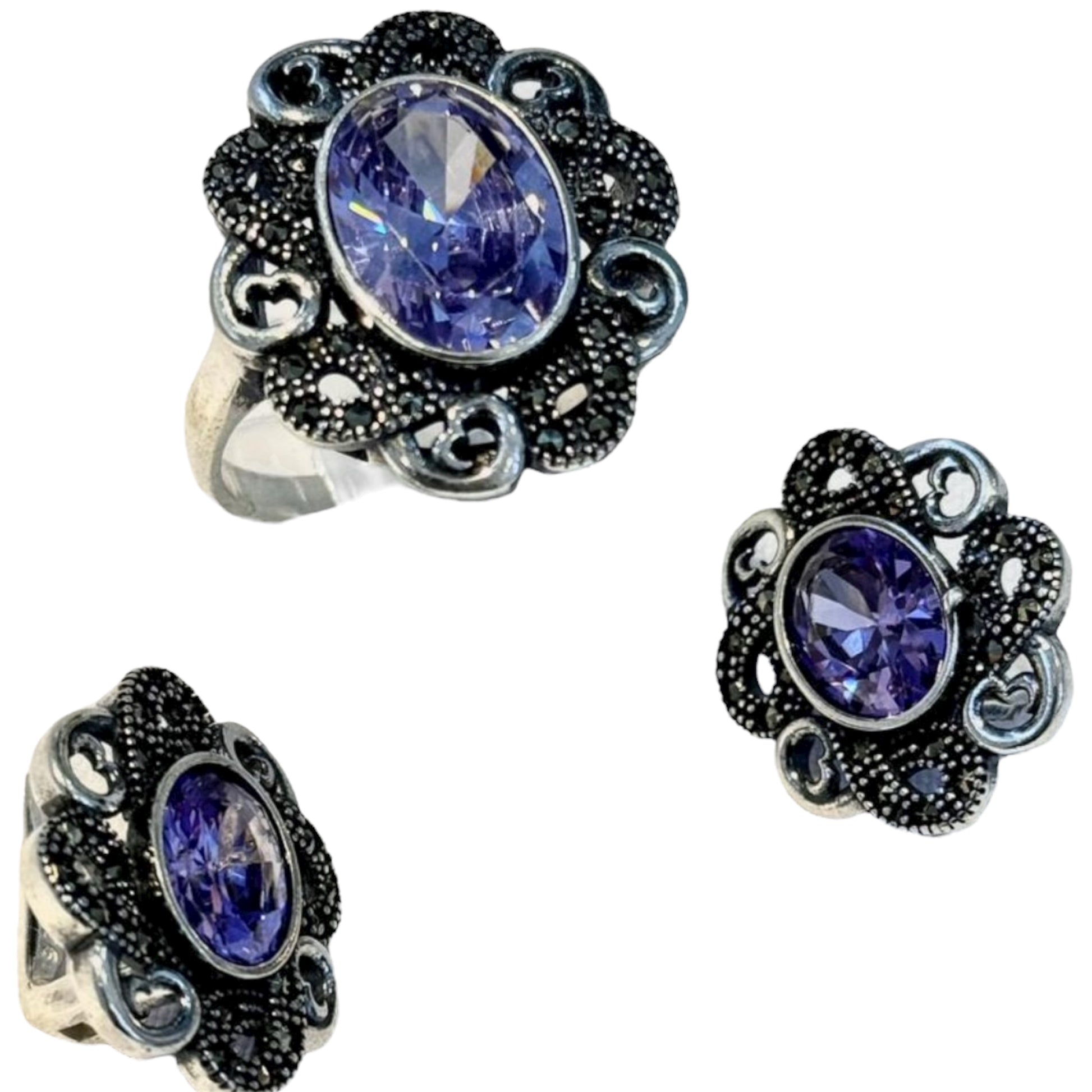 Juego de piedras marquesitas en plata 925 turca, con amatistas vibrantes que resaltan tu estilo con intensidad y carácter. Una joya que no pasa desapercibida.